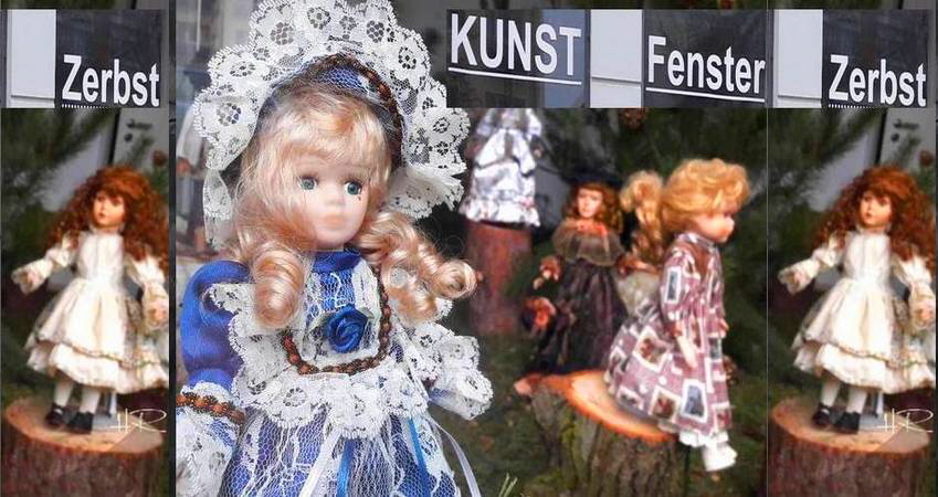 Aus zwei großen Pappkartons vom Flohmarkt besuchen 20 Puppen die gläserne Galerie KUNST-FENSTER Zerbst Breite 12 und können rund um die Uhr bewundert werden.Die märchenhafte Präsentation