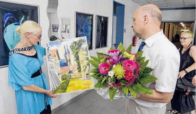 Malerin schenkt Bernhard Böddeker ein Bild. Es soll vor dem Sitzungssaal hängen.
